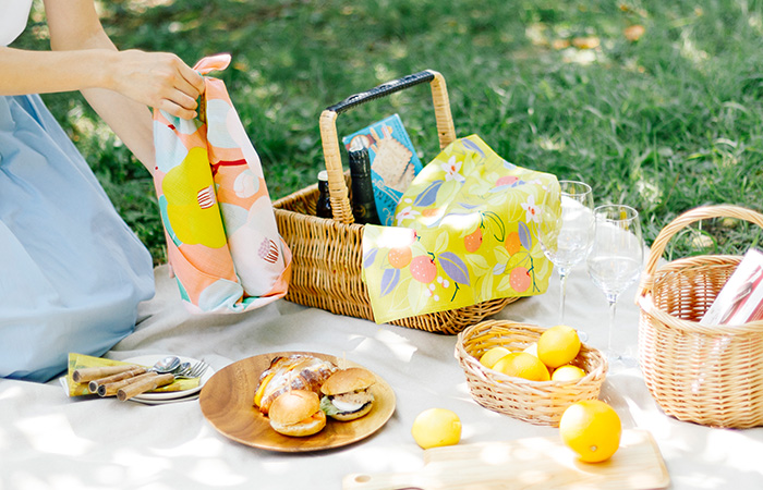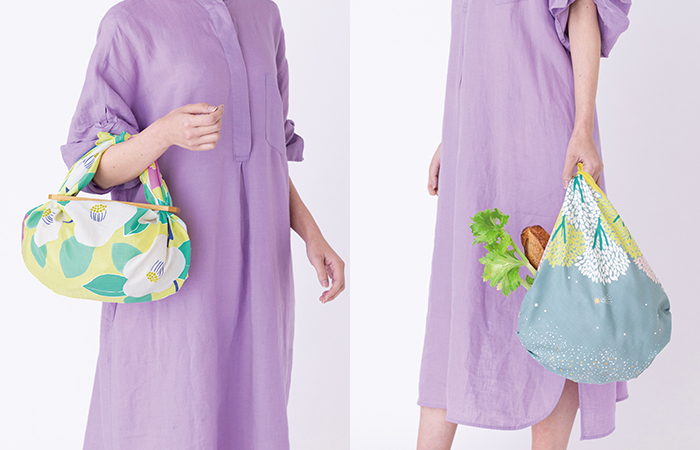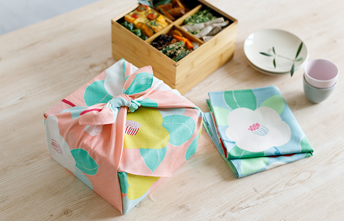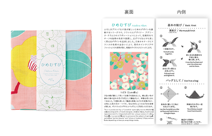 パリ在住フランス人デザイナー アデリーヌ・クラムとむす美がコラボレーションしたシリーズです。オーガニックコットンの生地に日本の伝統文様とアデリーヌ独自の色彩感覚が織りなすデザインは、日常に新鮮な美しさを添えてくれます。70㎝は菓子折りやお酒のギフトラッピング、モダンなお重包み、エコバッグとして人気です。