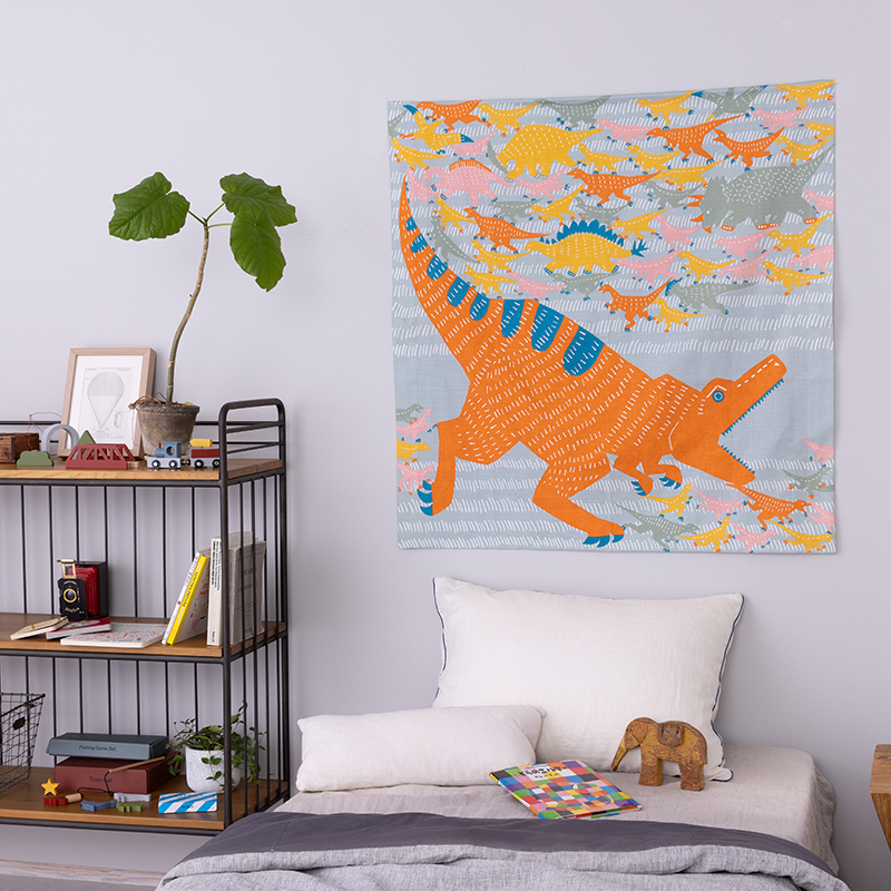 kata kata むすびの特徴と言えば、生き生きとした動物たち。型絵染作家ならではの手仕事感のあるラインや、ふろしきの枠を超えたダイナミックな構図が世代や国を超えて大人気です。新しく生地をオーガニックコットンに見直し、よりサスティナブルなニーズにもご利用いただけるようになりました。100cmは新柄として「きょうりゅう」が登場!「クマ」「クジラ」「ラッコ」「コアラ」は配色をリニューアルしています。