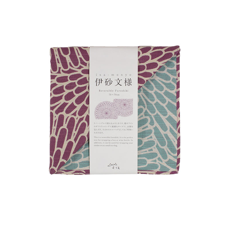 伊砂文様研究所が生み出した吉祥文様の数々をふろしきブランドであるむす美がふろしきとして魅力的に見えるサイズや色、構図を編集し、京都の熟練染工場による「両面染め」の技術と組み合わせたふろしきです。表裏の美しい配色にこだわり、結んだときに両面が見えて華やかになるよう計算されています。