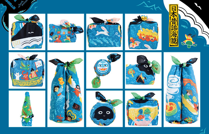 「日本昔話」は、日本に古くから伝わる伝承や物語のことで、世代を超えて語り継がれてきました。海・山・妖怪の物語のシーンを集めてふろしきにデザインしました。