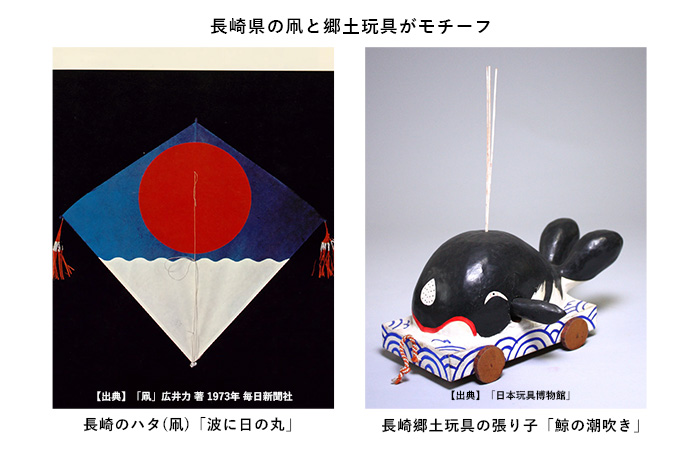 【デザイン】「郷土玩具」は日本全国にある郷土玩具31種類をパズルのように敷き詰めたデザイン。「くじら」は長崎のハタ(凧)と長崎郷土玩具の張子を組み合わせている。