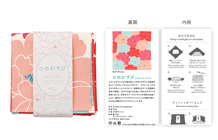 パリ在住フランス人デザイナー アデリーヌ・クラムとむす美がコラボレーションしたシリーズです。オーガニックコットンの生地に日本の伝統文様とアデリーヌ独自の色彩感覚が織りなすデザインは、日常に新鮮な美しさを添えてくれます。現代のインテリアやファッション、また和のテイストとも相性が良く自然に溶け込みます。50㎝はお弁当やギフトラッピング、タペストリーとして人気です。